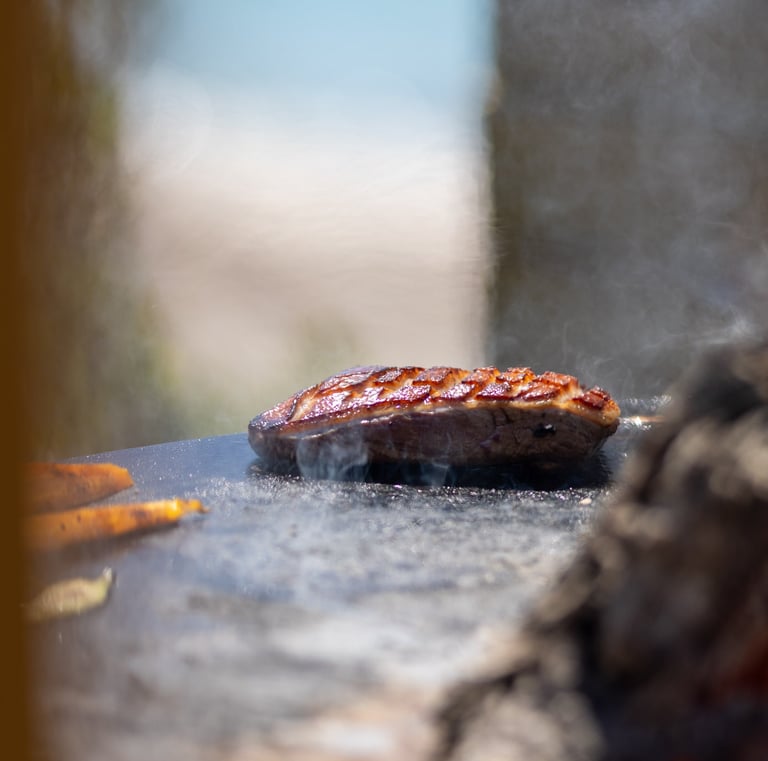 Cuisine au brasero, viandes fraîches, ambiance plage.